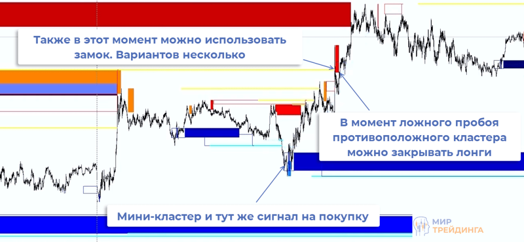они могут использоваться для определения точки выхода из рынка. Практика показывает, что чаще всего кластеры ложно пробиваются, непосредственно в момент пробоя можно фиксировать профит;