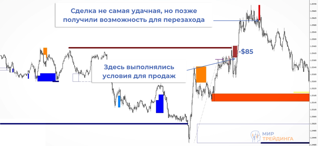 Перезаход позволит войти в Sell на максимуме восходящего движения. При стопе в 10 пунктов ($100) трейдер мог заработать 100+ пунктов ($1000+). То есть одна прибыльная сделка дала профит, превышающий полученный ранее убыток в 10+ раз.