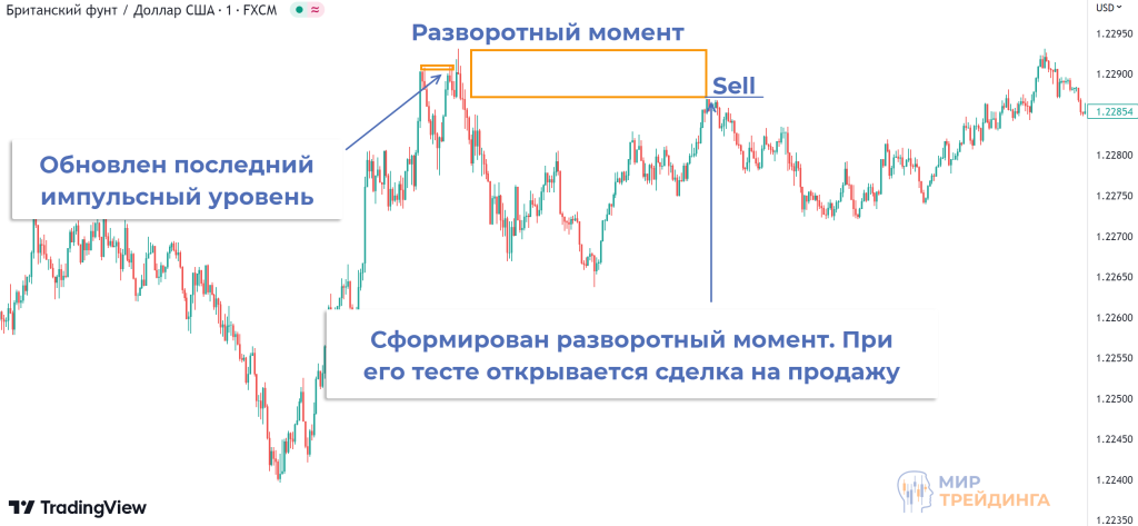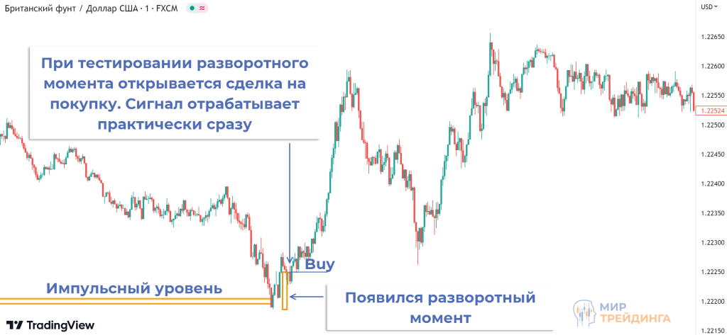 если не используется индикатор, то нужно определить момент смены тенденции. То есть построить первый импульсный уровень новой тенденции. Его ретест также дает сигнал для входа в рынок.