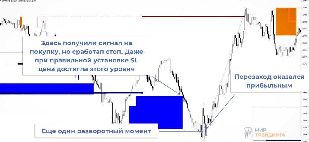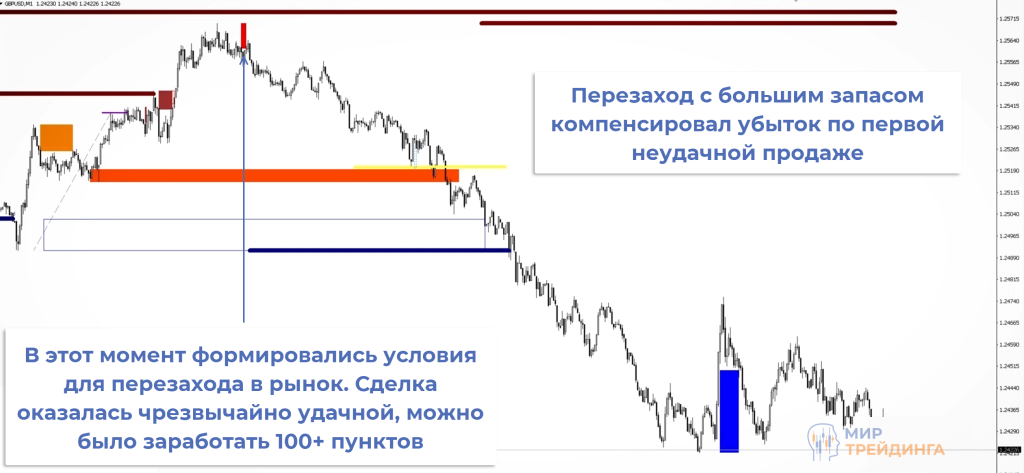 В первом примере сделка на покупку заключена по всем правилам. Стоп был выставлен без ошибок, но он сработал. Практически сразу после этого получили импульсное бычье движение одной свечой. Появился новый разворотный момент и в течение 2 минут он был протестирован, в этот момент нужно было перезаходить в рынок. В итоге профит по сделке в 3+ раза превысил размер стопа. Трейдер не только компенсировал убыток, но и вышел в плюс.
