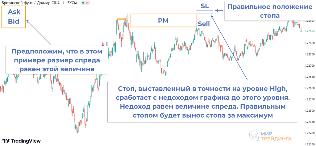 При входе в рынок нужно учитывать спред, это важно при установке стоп-лосса. Например, продажи открываются по Биду, но стоп для продаж сработает по Аску. Если установить SL в точности на максимуме (за противоположной границей разворотного момента), то стоп сработает даже без обновления High.