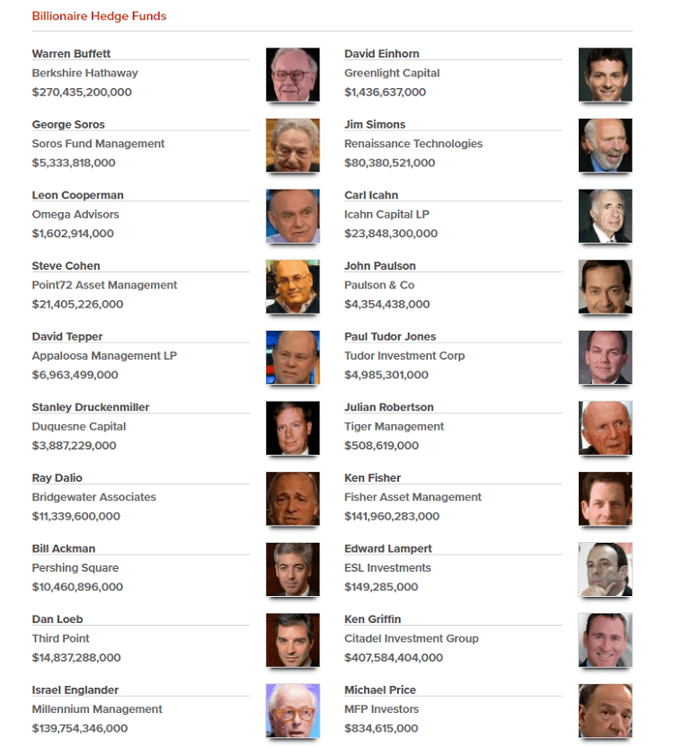 Например, знаменитый Уоррен Баффет и его фонд Berkshire Hathaway имеет под управлением $ 270 млрд. У Джима Саймонса и его фонда Renaissance Technologies сумма поменьше, но не менее внушительная – $ 80 млрд.