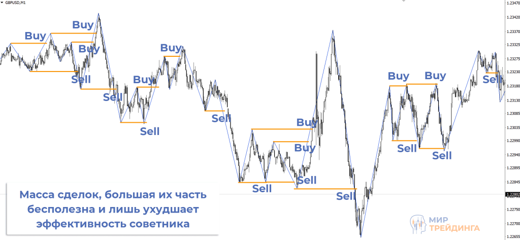 Подвох в том, что при переходе с Н1 на М5 частота проверки условий для дополнительных сделок возрастает в 12 раз. На Н1 условия проверяются 1 раз в час, на М5 – 12 раз за час. Из-за этого можем получить обилие дополнительных сделок, которых бы не было при торговле на часовом таймфрейме.