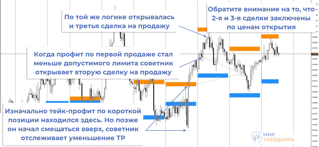 уровни зависят от волатильности, поэтому их положение может меняться. Если при этом происходит уменьшение тейк-профита и он становится меньше 10 пунктов, то советник открывает дополнительные сделки;