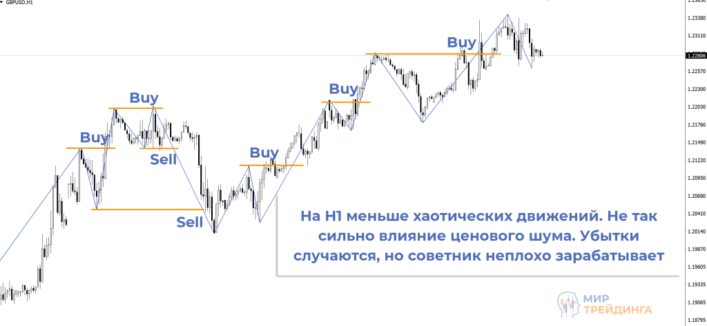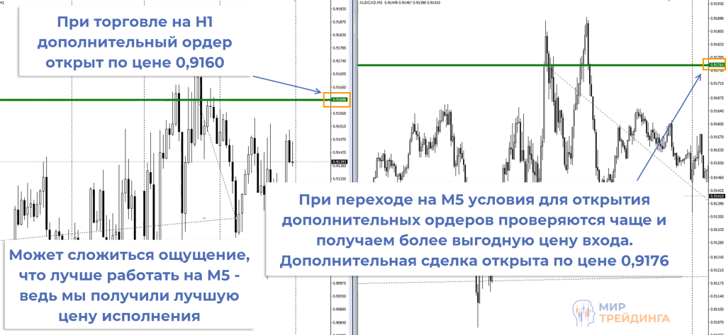 В примере за счет перехода на М5 цена, по которой открывалась дополнительная сделка, улучшилась на 158 пипсов.