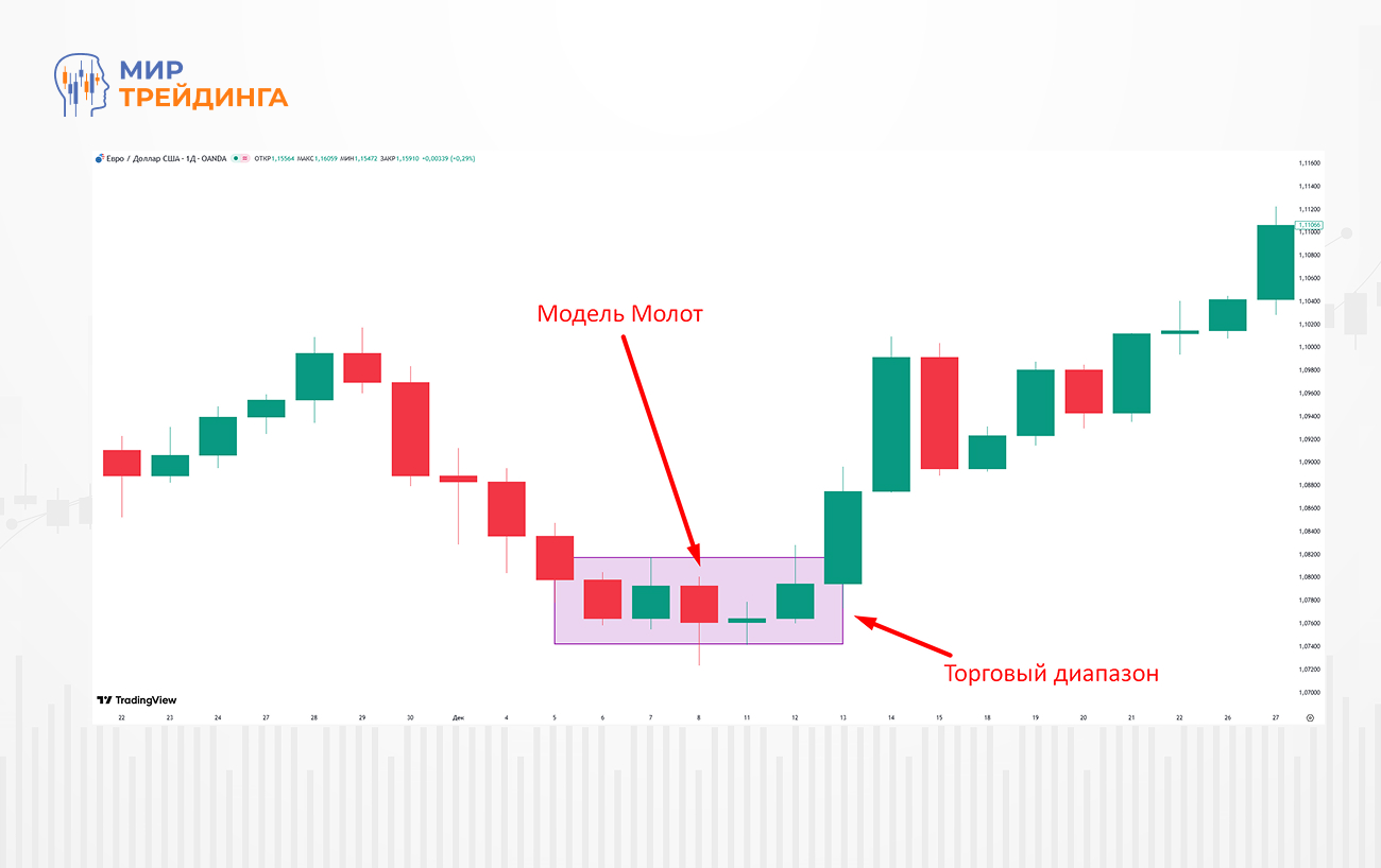 - “Молот” у нижней границы флэта на растущем объеме может обозначать сбор ликвидности.