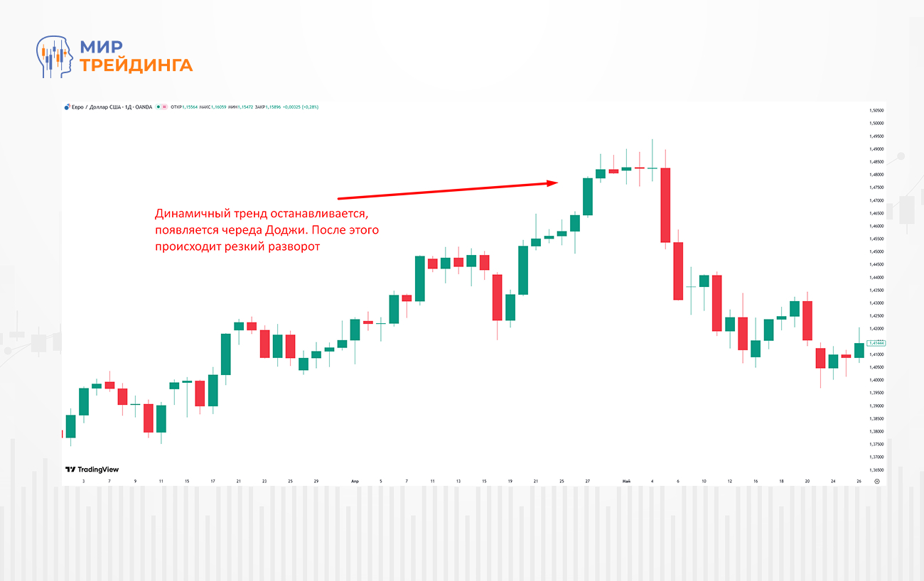 - Серия мелких доджи внутри дня может предвосхищать разворот дневной тенденции.