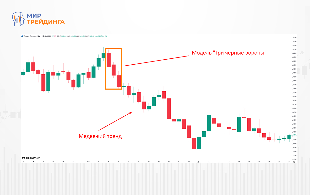 - Три черные вороны – обратный сценарий, свидетельствующий о силе продавцов и вероятном продолжении снижения.