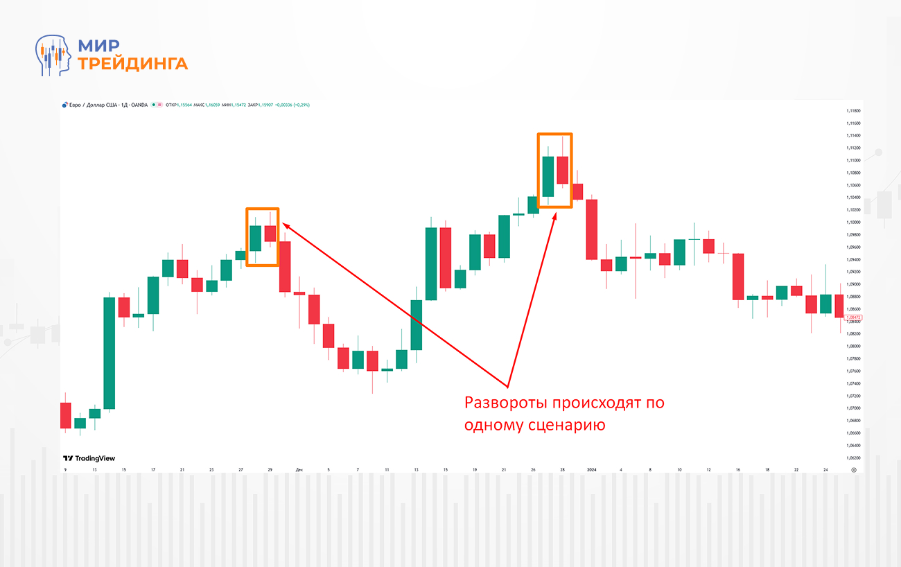 А теперь посмотрите на то, что происходило на меньшем фрейме. Вторая свеча полностью поглотила первую.