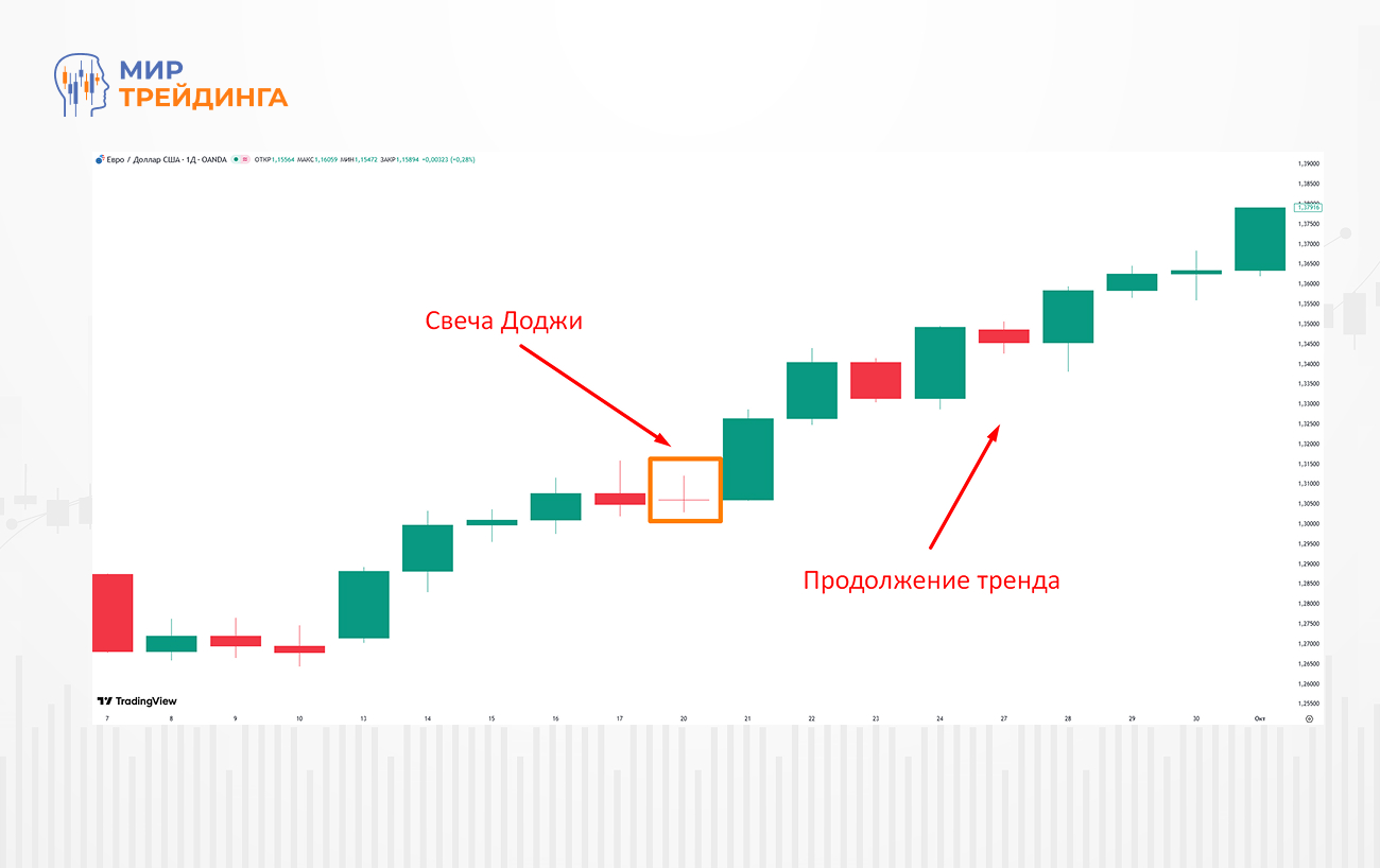 Свеча Доджи возникает, когда цены открытия и закрытия практически совпадают. Это признак равновесия: рынок временно остановился, и участники не готовы двигаться дальше без новой информации или какого-либо другого катализатора движения. В зависимости от контекста, доджи может быть как сигналом паузы перед продолжением тренда, так и признаком готовящегося разворота.