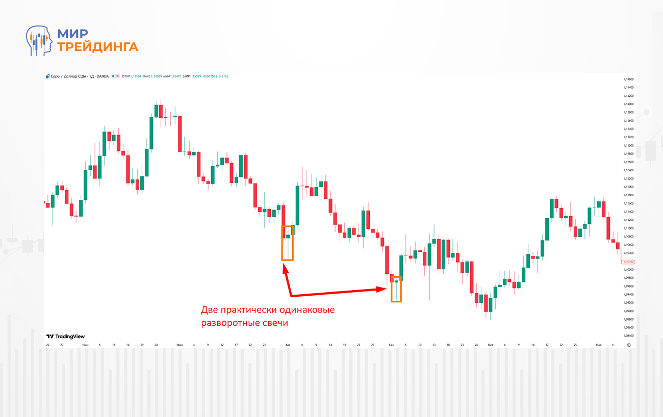 Такой подход особенно полезен для реактивной торговли, когда важна не только точность, но и скорость принятия решений. Свечной анализ дает возможность читать рынок глазами, а не формулами. Свечи – это визуальная психология рынка. Они позволяют наблюдать, как эмоции превращаются в движение. Несколько примеров: