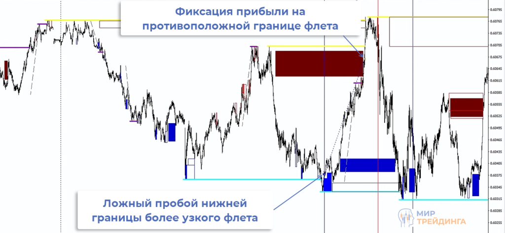 - NZDUSD. Сформировался довольно широкий флет, а в нем – более узкий. Ложный пробой нижней границы этого более узкого флета дал точку входа на покупку. Фиксация прибыли на противоположной границе обеспечила прибыль в 300 пипсов;