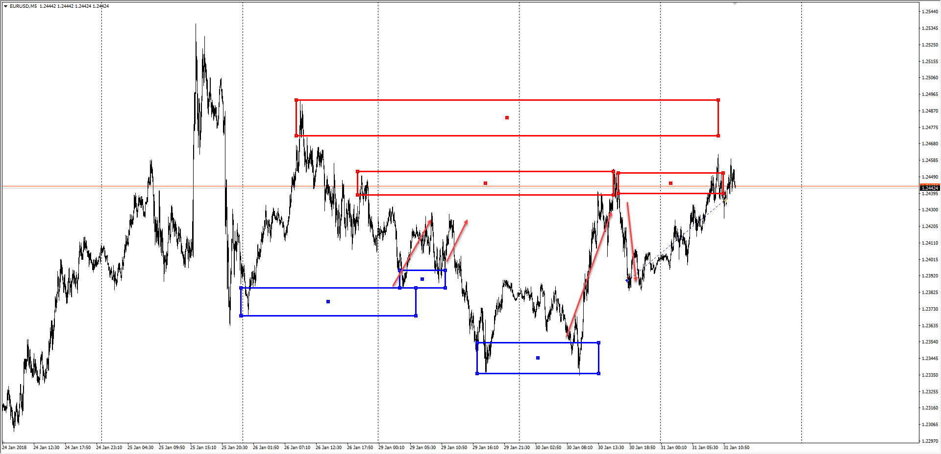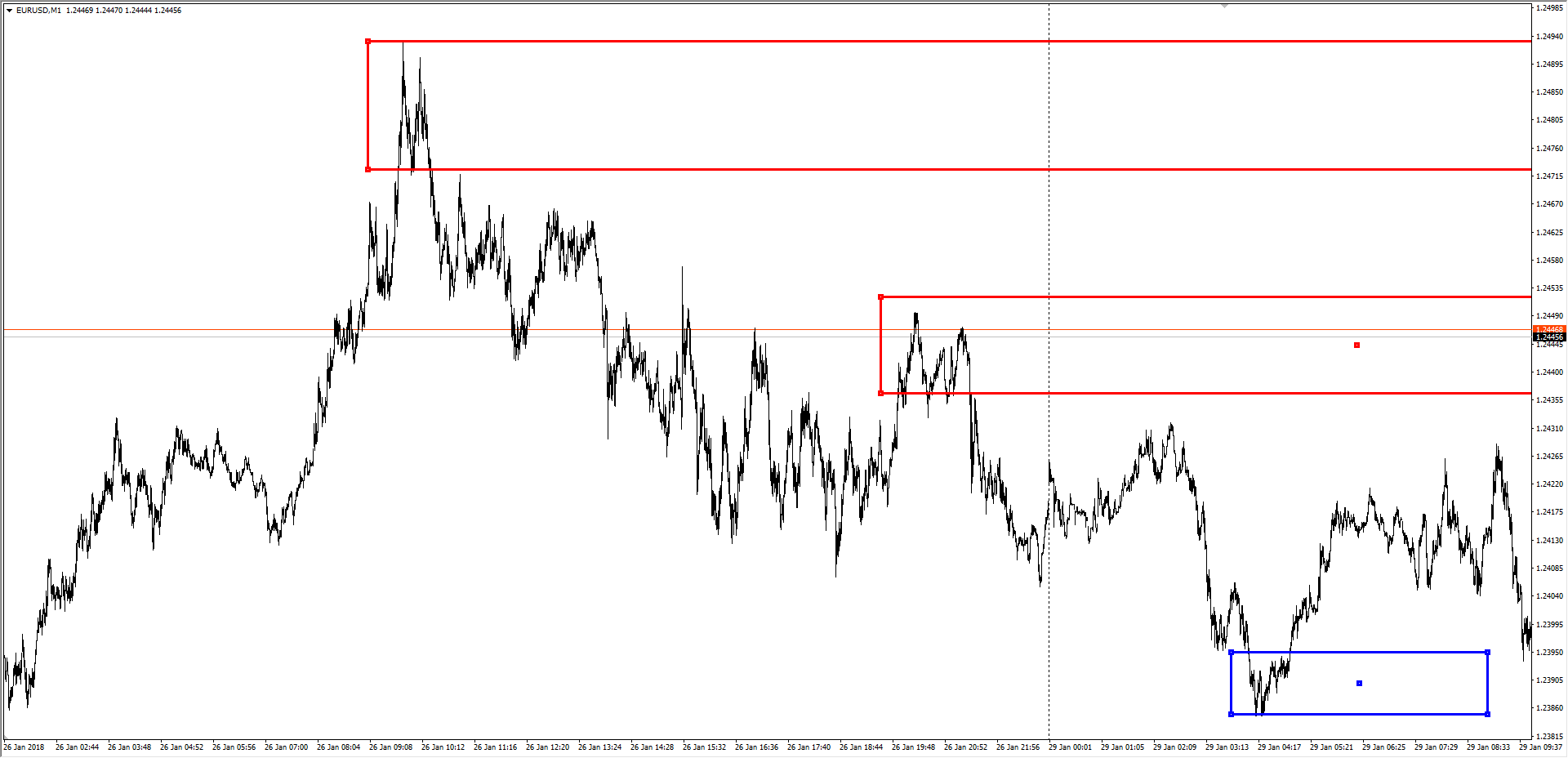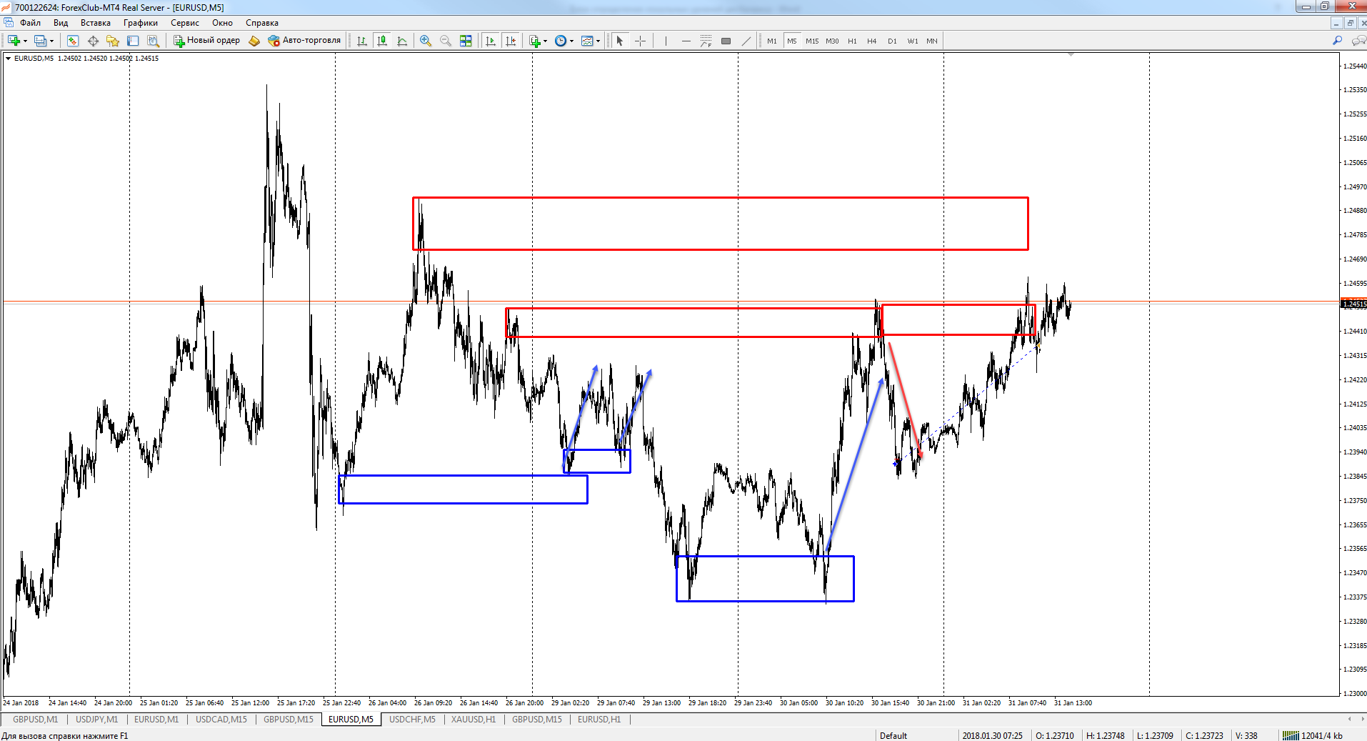 Этот принцип работы сохраняется на любых таймфреймах. Каждый уровень дисбаланса создает новые флеты, график движется от одного диапазона к другому, по пути формируя новые флеты.