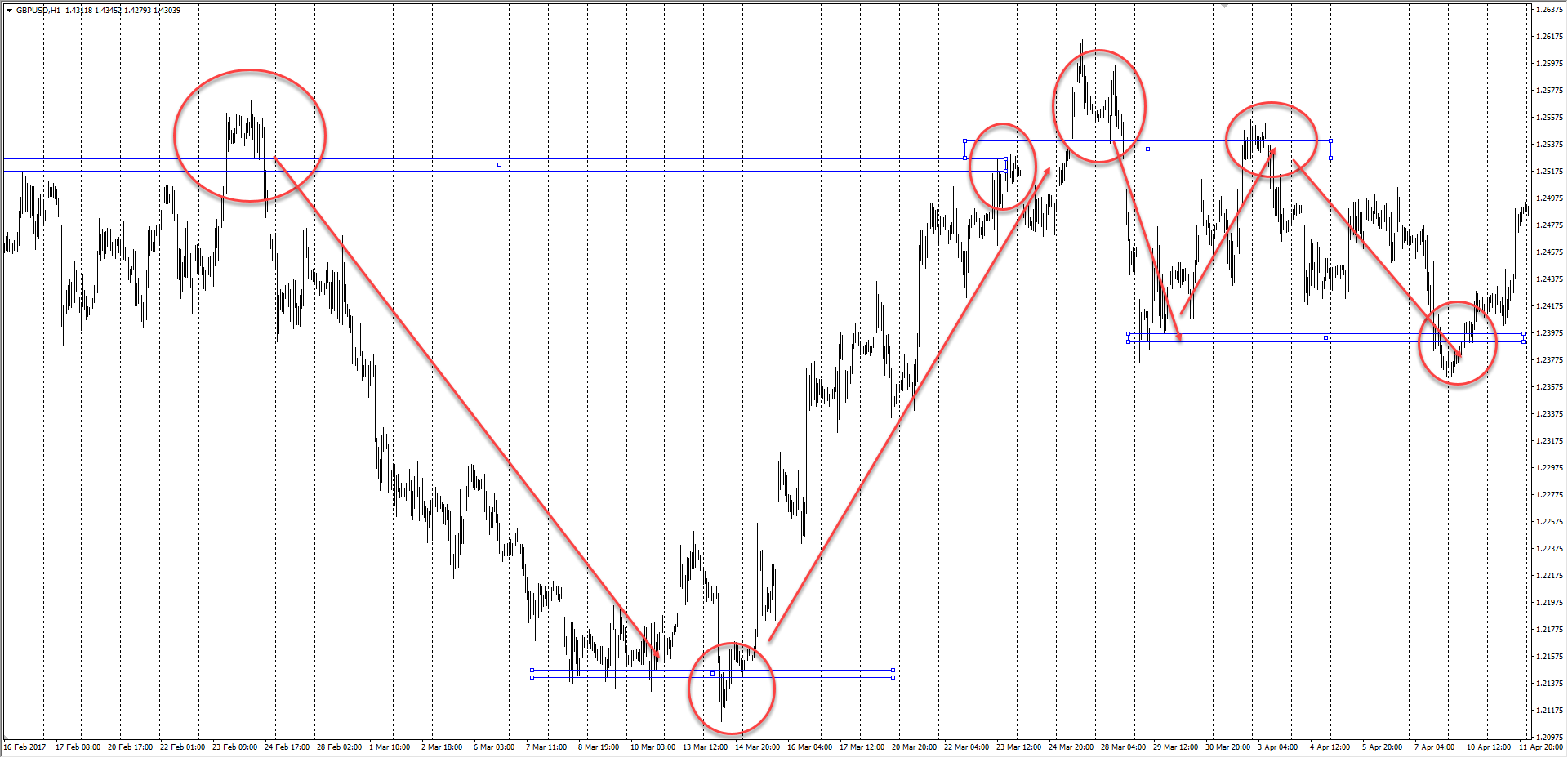На графике отмечаем уровни, от которых график прошел как минимум 35 пунктов (350 пипсов). Для подвижных инструментов с дневной волатильностью больше 100 пунктов (1000 пипсов) это расстояние увеличивается до 45 пунктов (450 пипсов).
