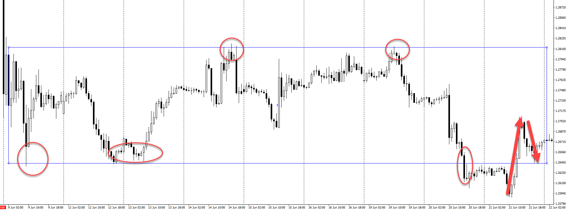 Во флете накапливается большое количество покупателей и продавцов, причем заранее невозможно предсказать направление пробоя. Цена может пробить как верхнюю, так и нижнюю границу диапазона. Часто пытаются торговать на отбой от границ с большими стопами, но это не особо эффективный подход.