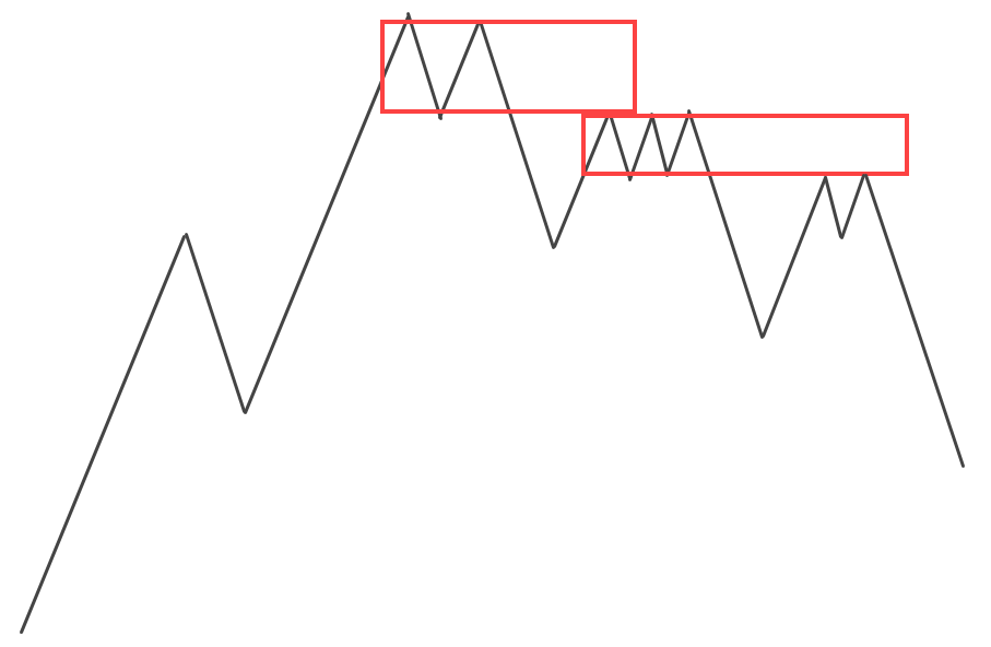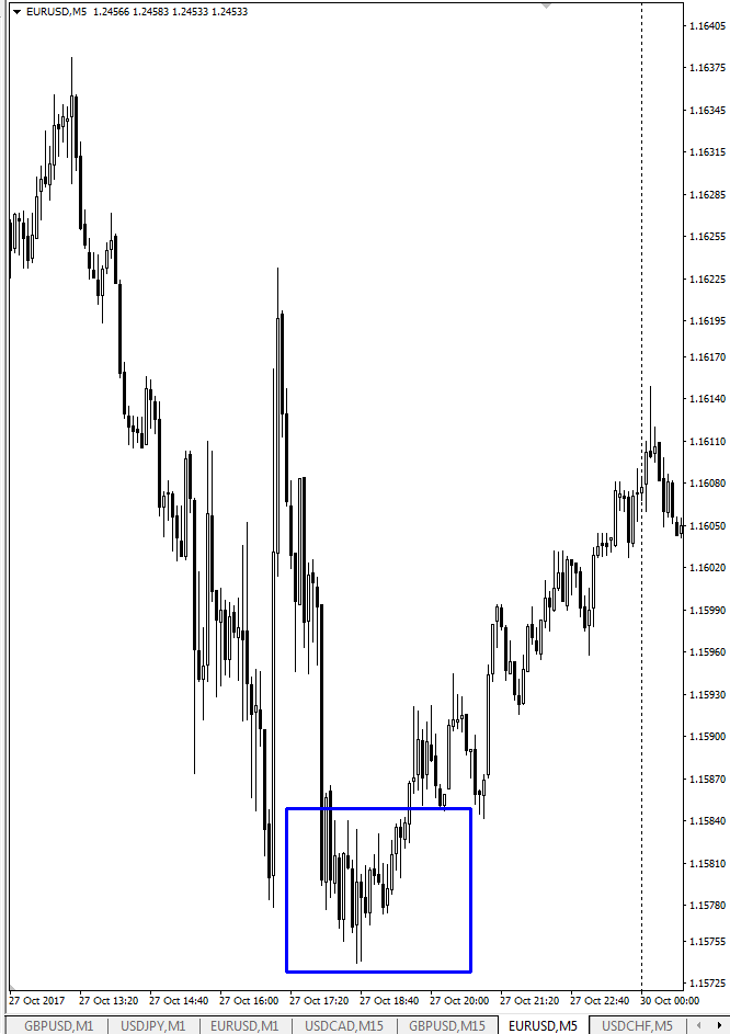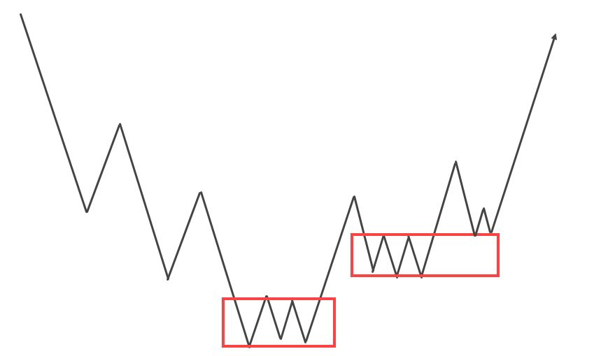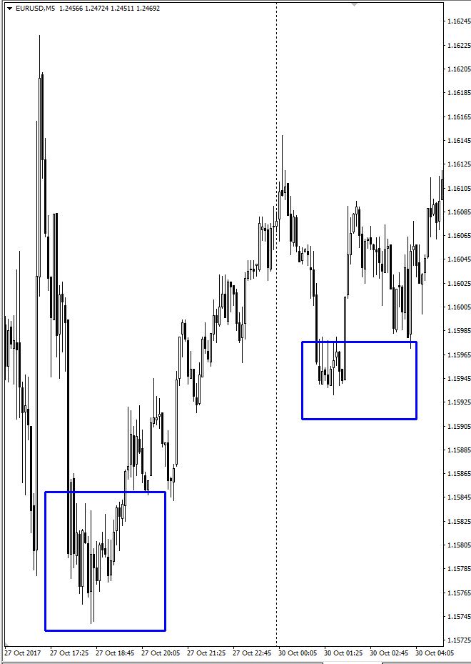 Что касается формирования, то такие участки легко идентифицировать по внешнему виду графика. Он всегда имеет М- либо W-образный вид. Никак иначе борьба между покупателями и продавцами выглядеть не может.