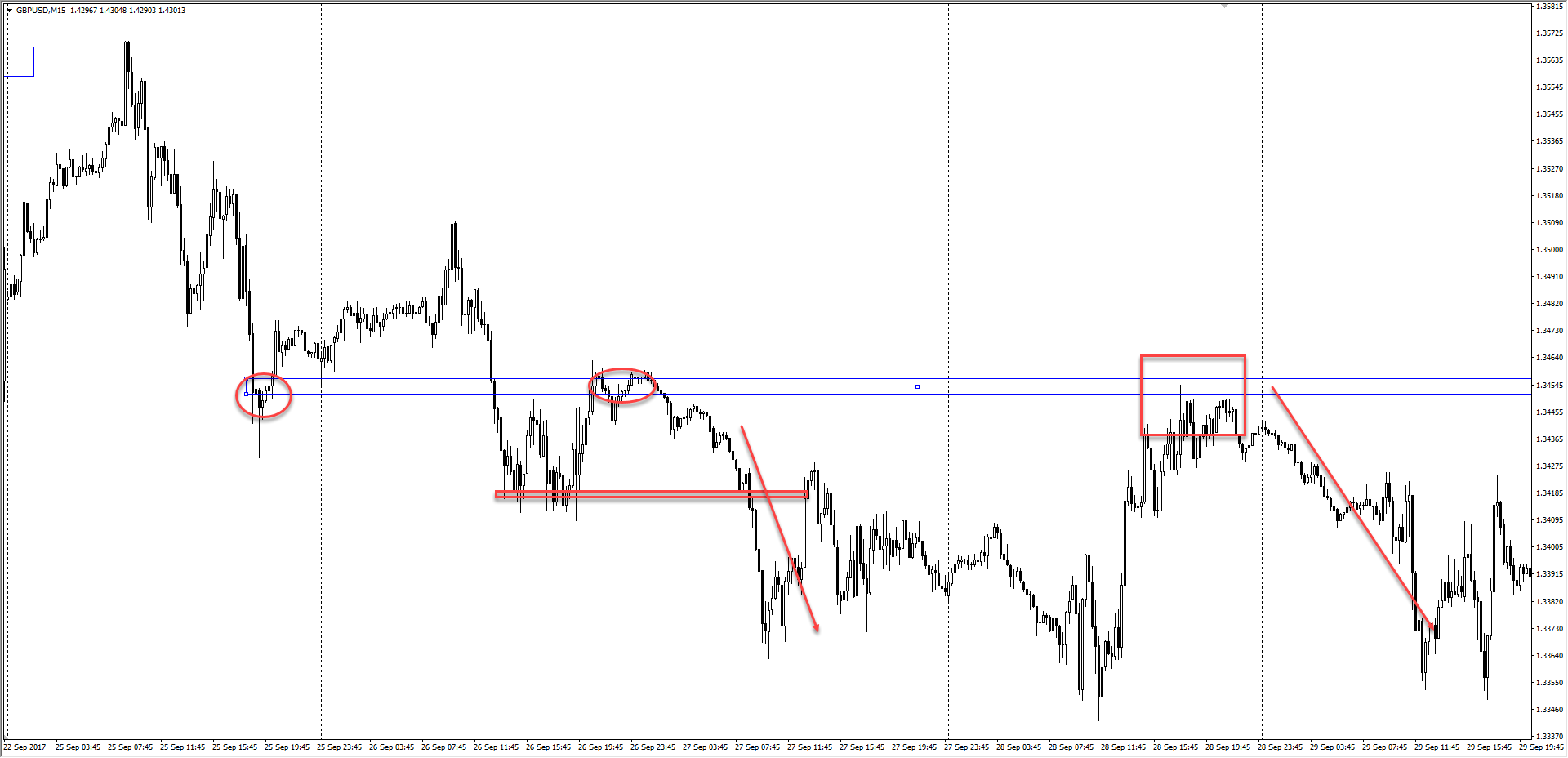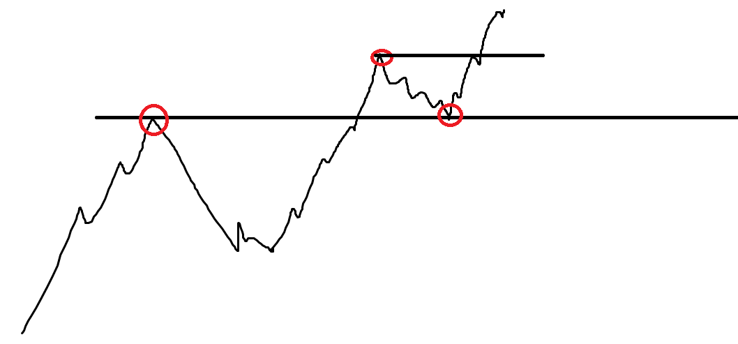Схема формирования зеркального уровня. Сначала это было сопротивление, но после пробоя и теста оно превратилось в поддержку