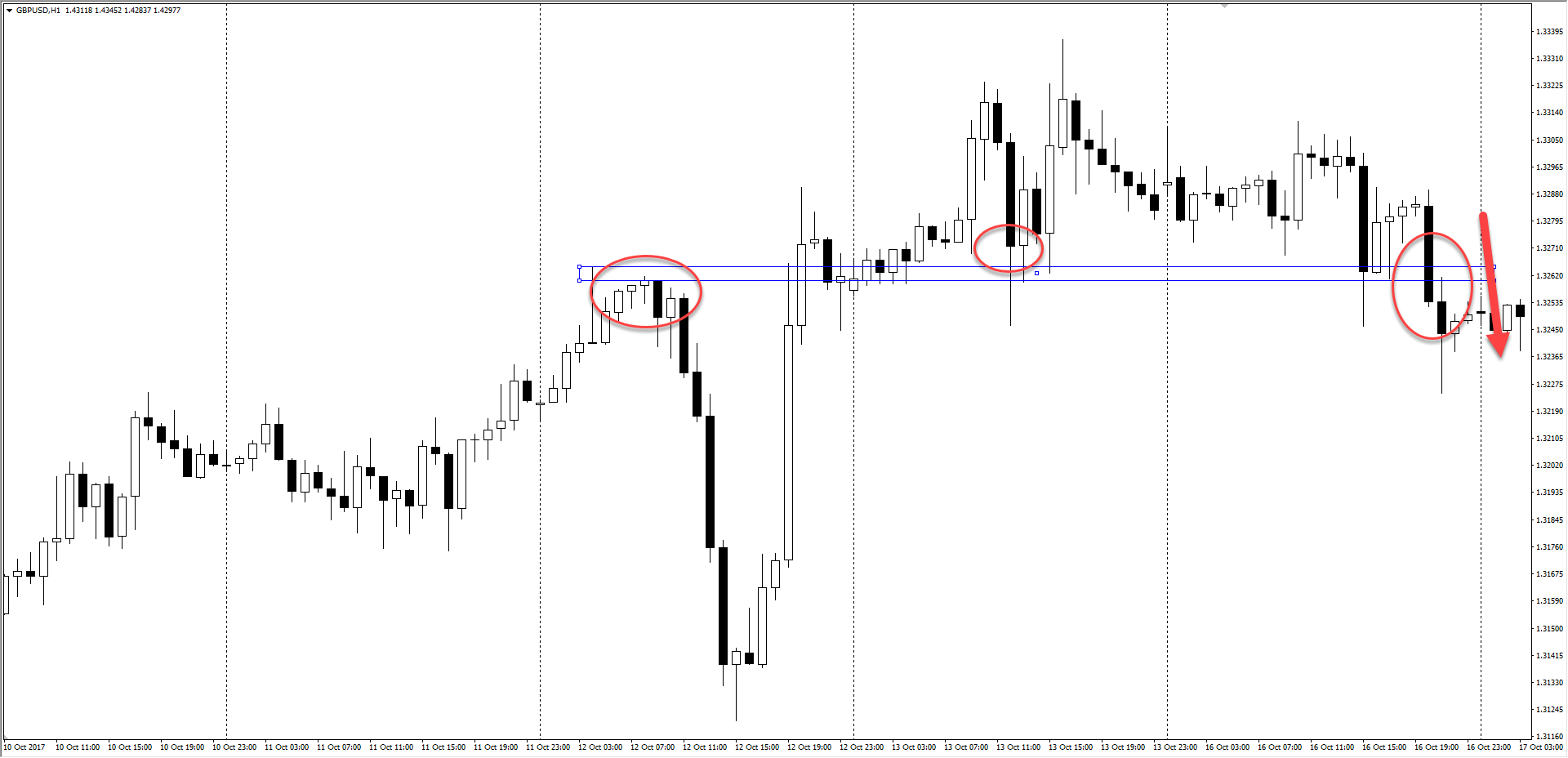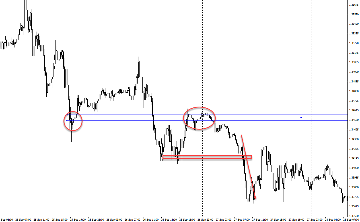 Сначала поддержка пробивается (крупный игрок), затем график возвращается в область над поддержкой, подтверждая ложный пробой