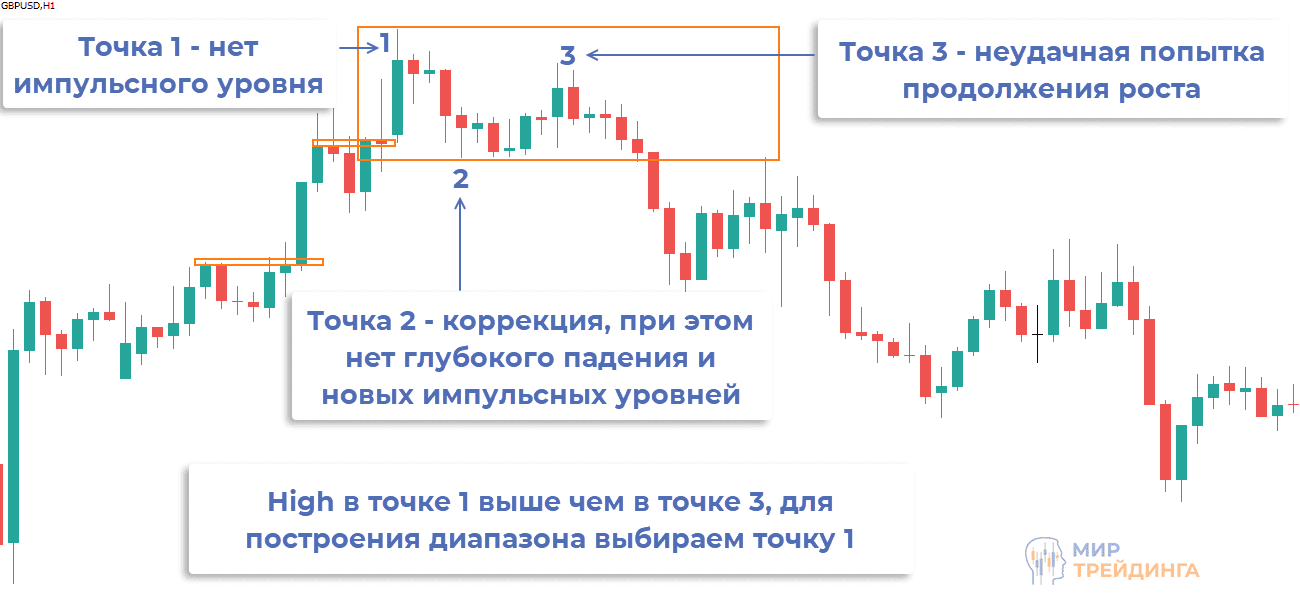 - после отката есть попытка продолжения восходящего движения, но максимум не переписывается и снова отсутствует импульсный уровень. Получаем 3 точку, можно строить зону,