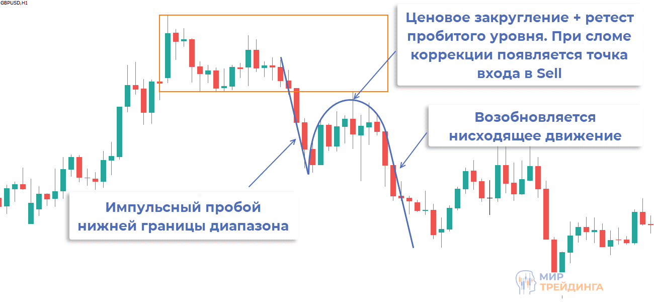 - после ретеста коррекция «ломается» и возобновляется движение в том же направлении, что и пробойный импульс. Момент слома отката – неплохая точка входа на продажу.