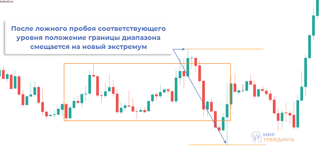 Если после пробоя границы цена вернулась в диапазон, то есть смысл перестроить его. Положение пробитой поддержки/сопротивления смещается на новый экстремум.