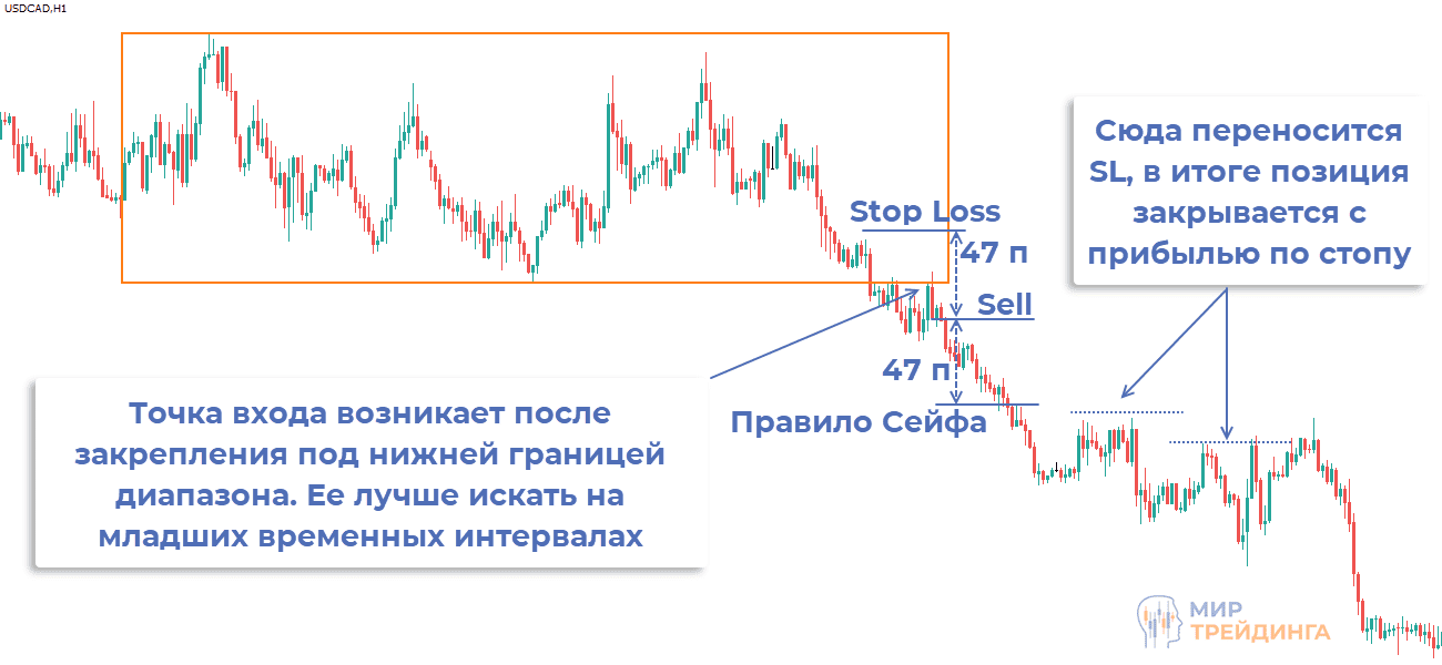 - основная цель – противоположная граница диапазона, здесь можно выставить тейк-профит. До этого есть смысл выполнить правило Сейфа, то есть закрыть половину объема после того как график пройдет в нужном направлении расстояние, равное SL.