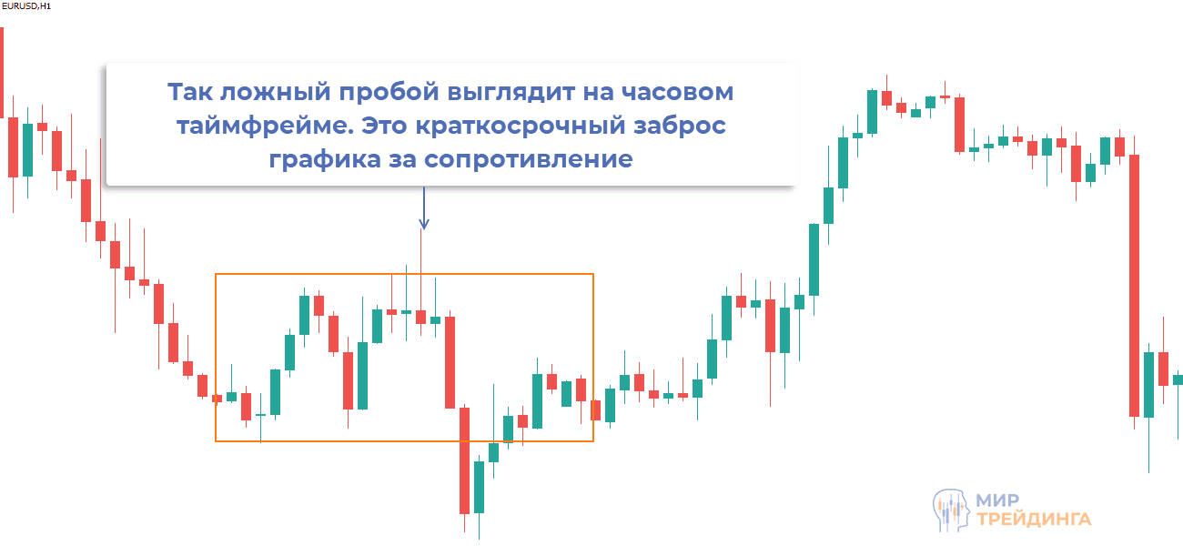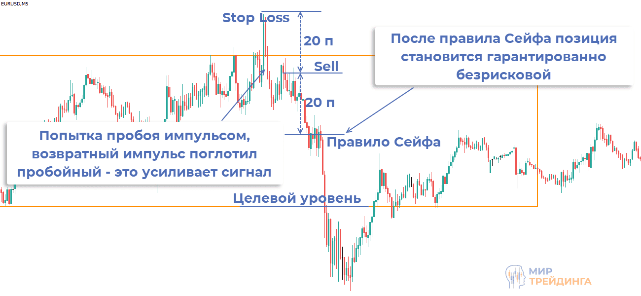 - в идеале после импульсной попытки пробоя график импульсом возвращается за уровень, это первый признак того, что скоро может сформироваться сигнал на продажу,